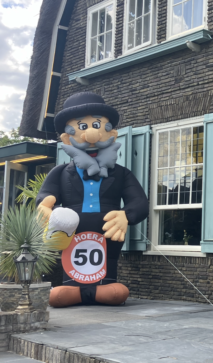 Wil je een jarige extra in het zonnetje zetten? Huur dan onze Sarah of Abraham opblaaspop van 3,2 meter hoog! Een echte blikvanger voor in de tuin of voor het huis.